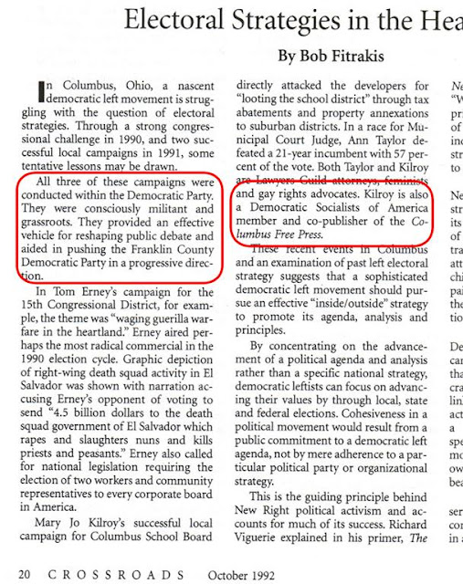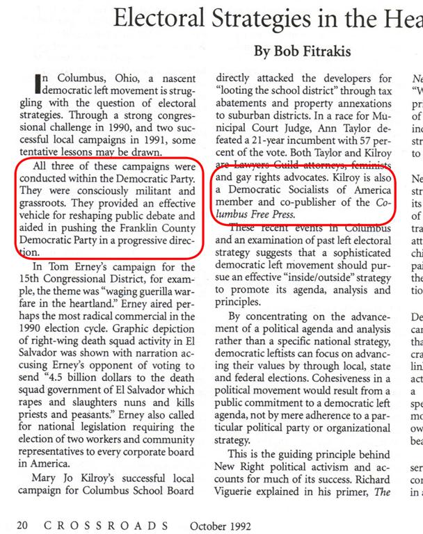 Now comes more confirmation of kilroy’s socialist ties from an article in Oakland California based marxist journal CrossRoads, October 1992. The author Bob Fitrakis, is also a long time D.S.A. member and was himself a Democratic Congressional candidate in 1992 in the same district.